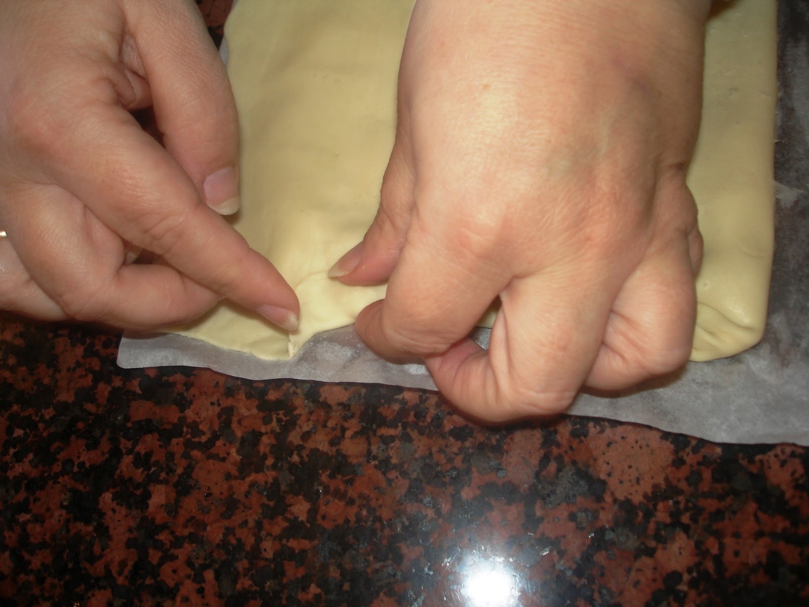 Rellena de crema la mitad de la lámina de hojaldre, dejando un margen para cerrarlo. Dobla el hojaldre sobre si mismo y ciérralo.
