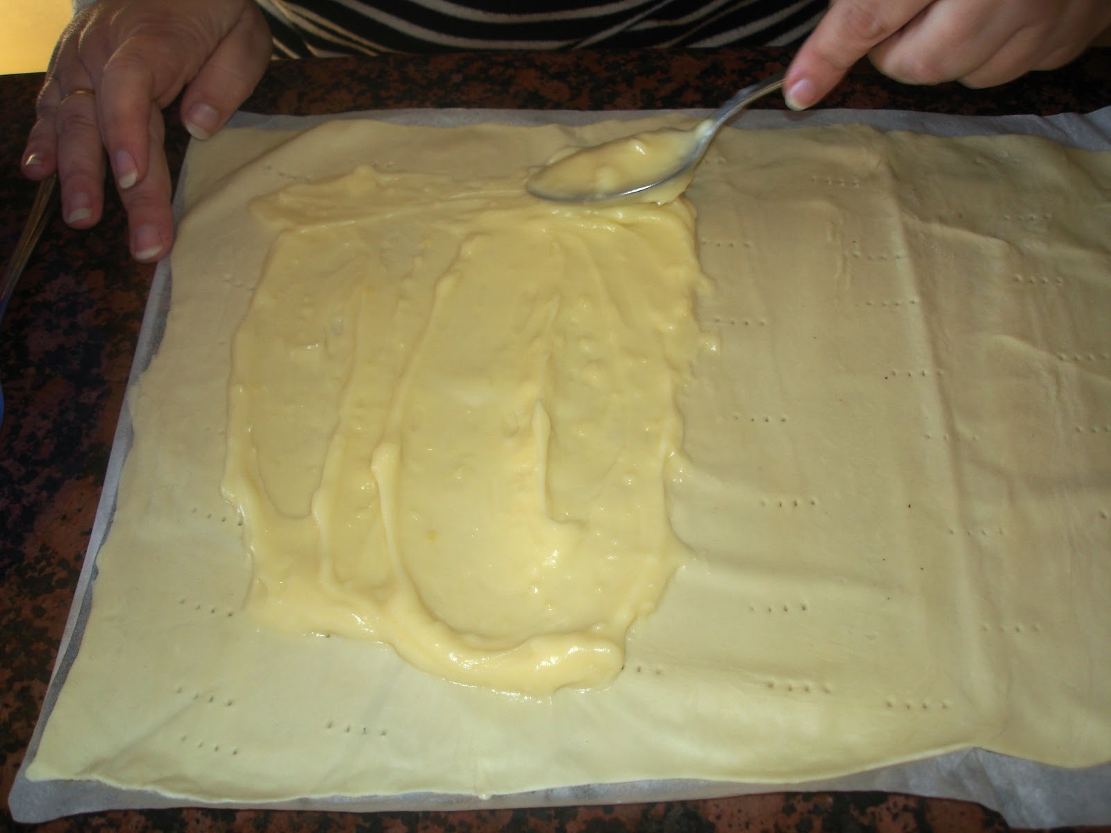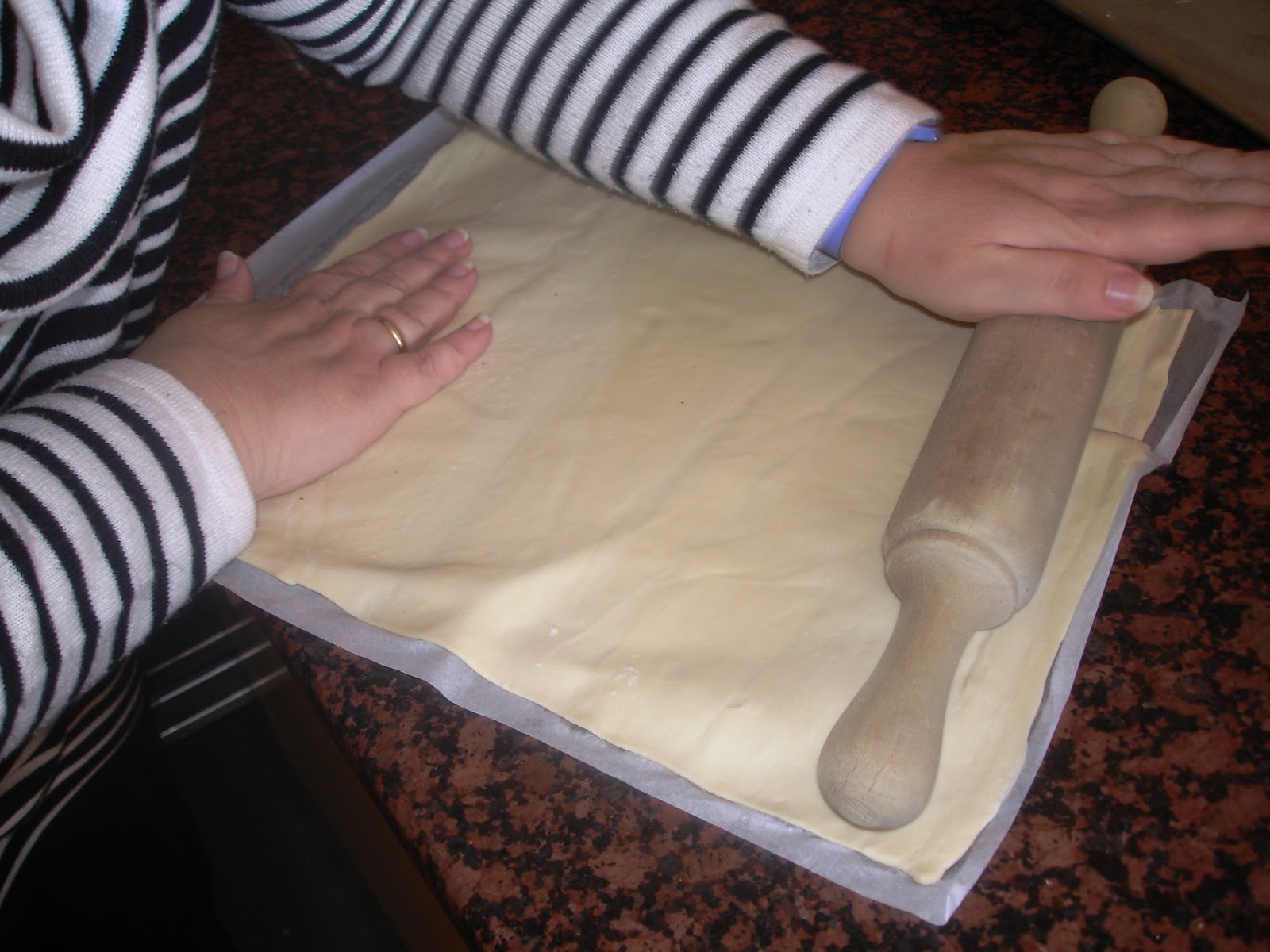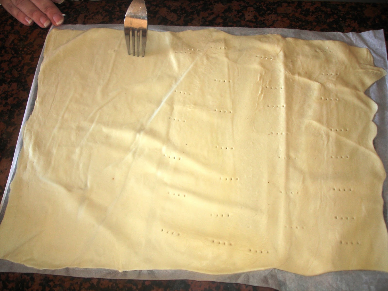 Estira un poco el hojaldre con un rodillo y pincha toda la superficie con un tenedor para que no suba demasiado.