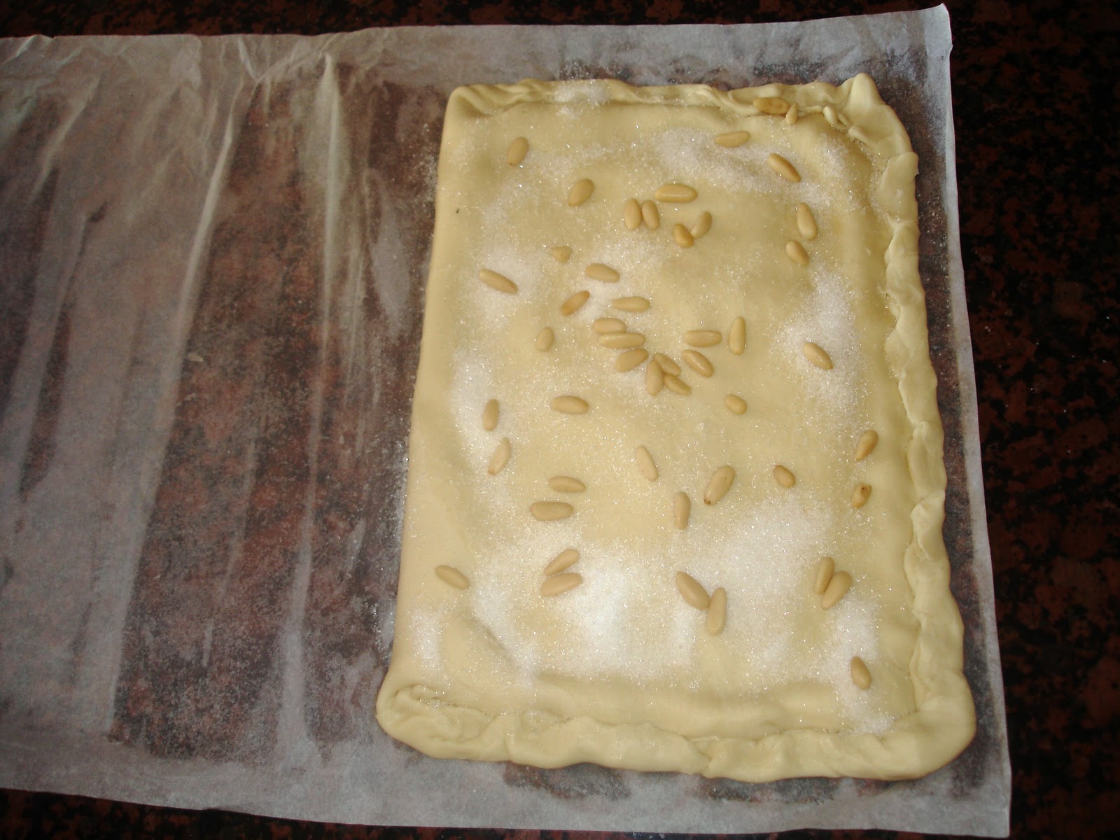 Espolvorea con azúcar y reparte por encima los piñones.