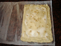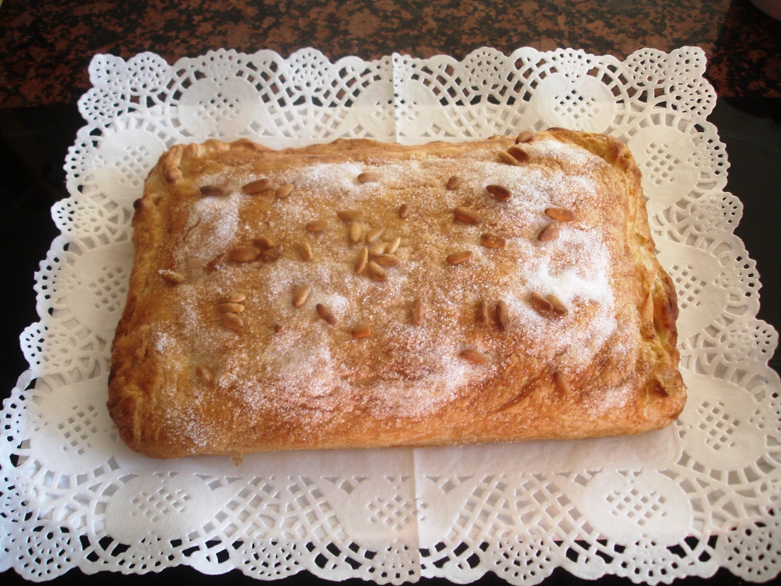 Esta coca es un comodín para cuando quieres quedar bien y no dispones de demasiado tiempo. Es un hojaldre relleno de crema y cubierto con azúcar y piñones. Es fácil, rápida y muy, muy rica.
